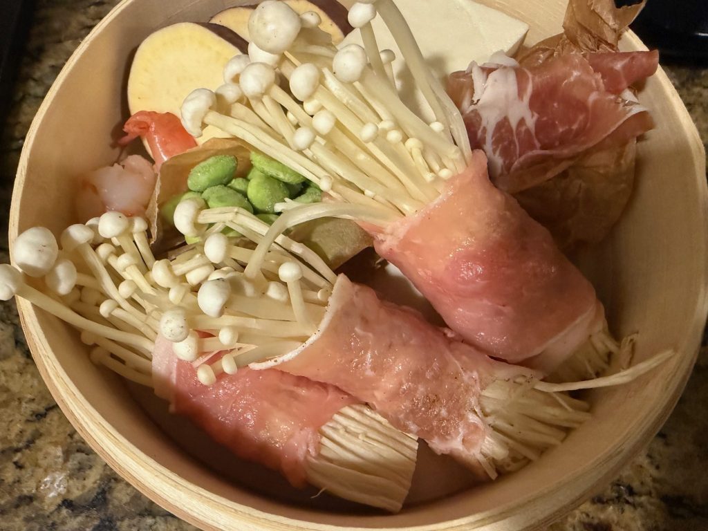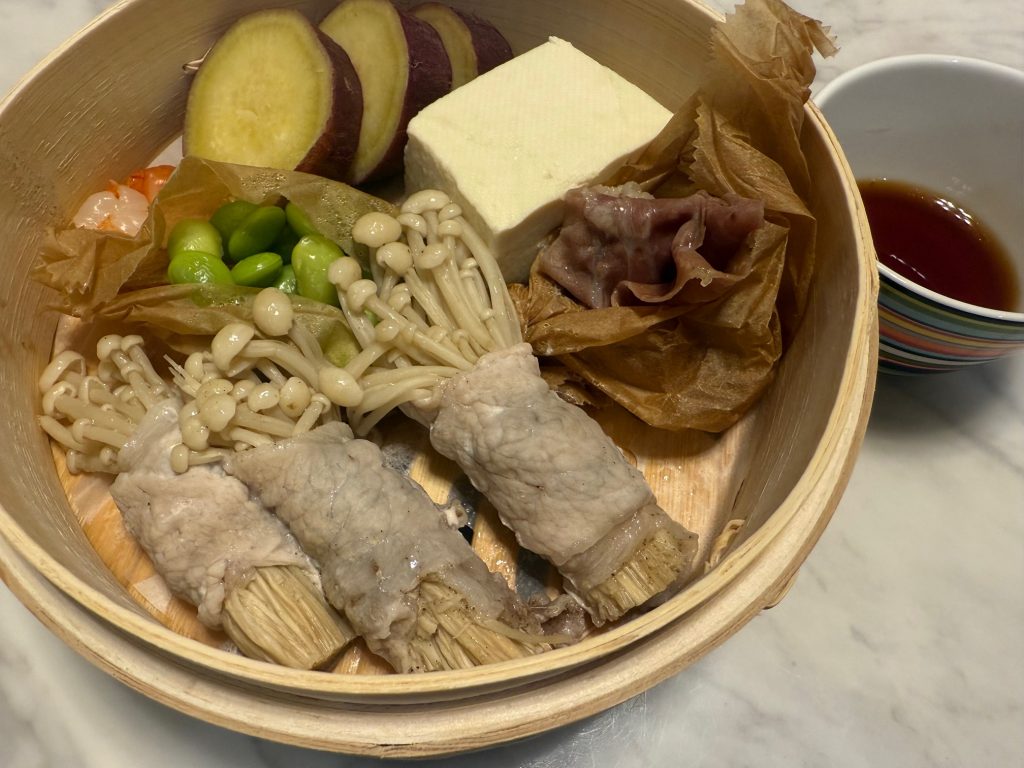 きのこや野菜の肉巻きやさつまいもは安定して好きですが、個人的に木綿豆腐、枝豆、生ハムが好きです。生ハムは火が通ってハムになりますが、塩気があるので豆腐と一緒に食べると美味しいです。