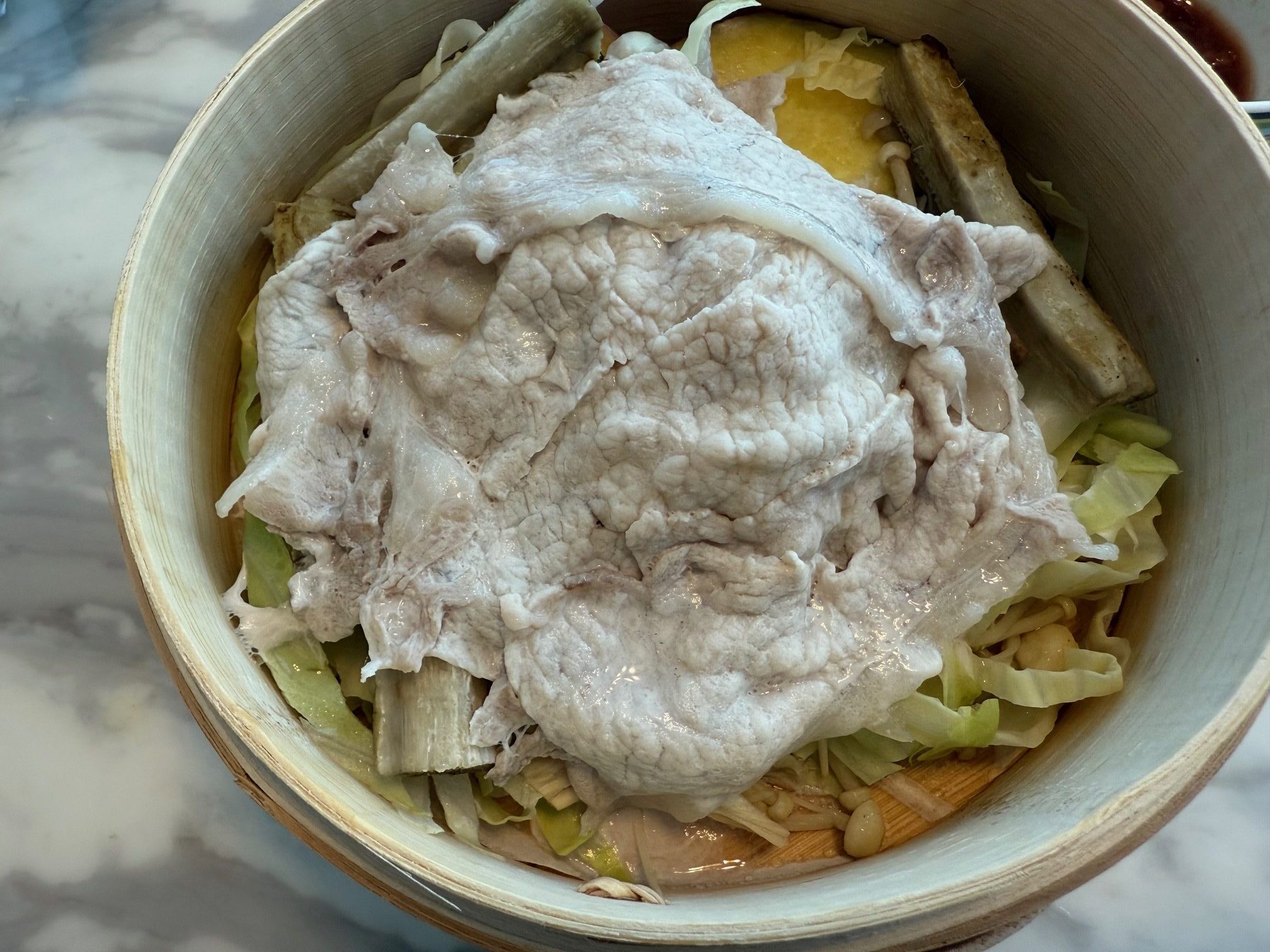 あと、きゃべつの千切りにえのき、ごぼうを敷き、薄切りの豚肉をのせたせいろ蒸しも大好き!ポン酢でさっぱりいただきます。