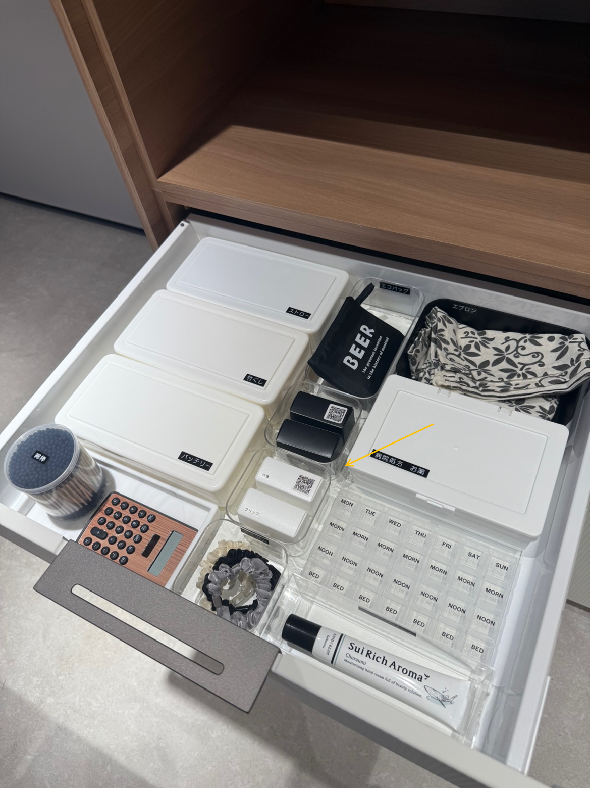ちなみに、引き出し内の収納を作る際、空間を四角く区切るのがポイントですが、収納ケースやトレーを入れて区切ってあげると収納が作りやすくなりますよ。
