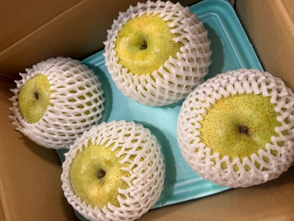 こちらは、「かおり」という品種の梨です。とにかく大きな梨で、大玉だと1個1キロ近くになるのだとか。大きいので大味になるかと思いきや、全くそんなことはなく、シャリシャリとした食感とさわやかな香りを感じながらしっかりと甘さを感じる梨です。